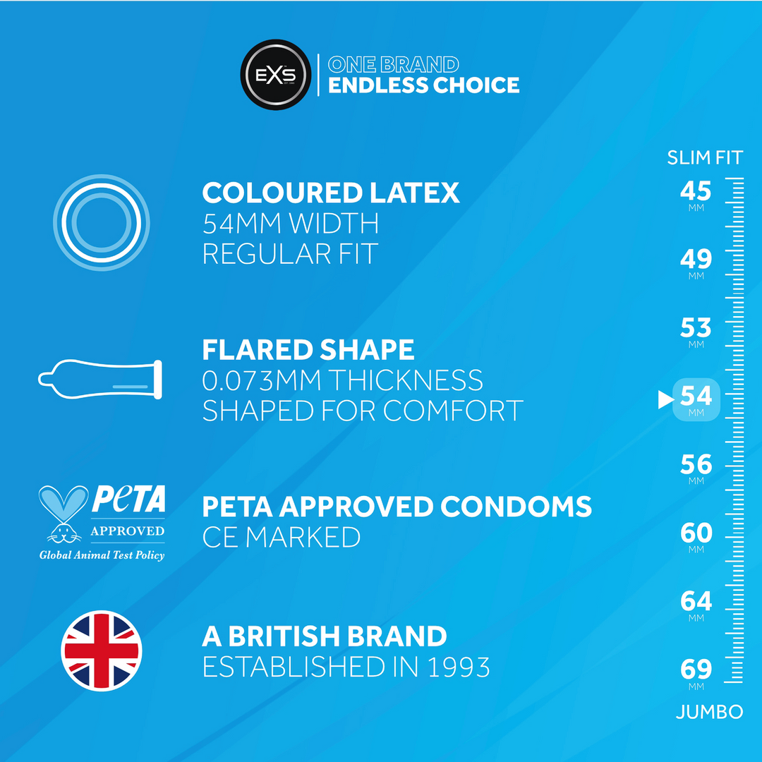 Zwarte verleiding??? Mysterie bij elke aanraking Dun maar sterk ??? 0,073 mm met vertrouwen Comfort fit 54 mm ??? Sluit prettig en zeker aan Siliconen glijmiddel ??? Soepel, sensueel contact Voordeelverpakking ??? 100 stuks voor veel nachten Een donkere twist op veilige spanning Zin om je avond net wat spannender te maken? De EXS Black Latex condooms geven bescherming een stijlvolle upgrade. De diepe zwarte kleur oogt chic en uitdagend, terwijl de sensatie heerlijk natuurlijk blijft. Ideaal als je houdt van luxe details in de slaapkamer, zonder gedoe. Voelt soepel, blijft betrouwbaar Meteen dikte van 0,073 mm zijn deze condooms dun genoeg om veel gevoel door te laten, maar stevig genoeg om je met een gerust hart te laten gaan. De flared head en tepelvormige tip zorgen voor een comfortabele pasvorm en een fijne flow, precies wanneer je het tempo opvoert. Glijdt moeiteloos mee metjullie spel Elk condoom is voorzien van siliconen glijmiddel voor een zachte, moeiteloze glijervaring. Wil je extra? Dan zijn ze ook te combineren met waterbasis glijmiddel of siliconen glijmiddel. Zo stem je alles af op jullie voorkeuren en fantasie??n. Kwaliteit die je niet hoeft te twijfelen EXS staat bekend om strenge controles: deze condooms zijn CE-gecertificeerd en getest volgens Europese normen. Ze zijn bovendien vegan en PETA approved. En fijn om te weten: de houdbaarheid loopt minimaal 3 jaar vanaf aankoop. Specificaties&afmetingenAantal ??? 100 stuks Merk ??? EXS Condooms Type ??? Black Latex, glad Kleur ??? Zwart Materiaal ??? Natuurlijk rubber latex Glijmiddel ??? Siliconen, niet zaaddodend Breedte ??? 54 mm Lengte ??? 190 mm Dikte ??? 0,073 mm Vorm ??? Flared head Tip ??? Tepelvormig reservoir Alcoholvrij??? Ja Certificering ??? CE, EU getest Vegan ??? Ja, PETA approved Houdbaarheid ??? Min. 3 jaar