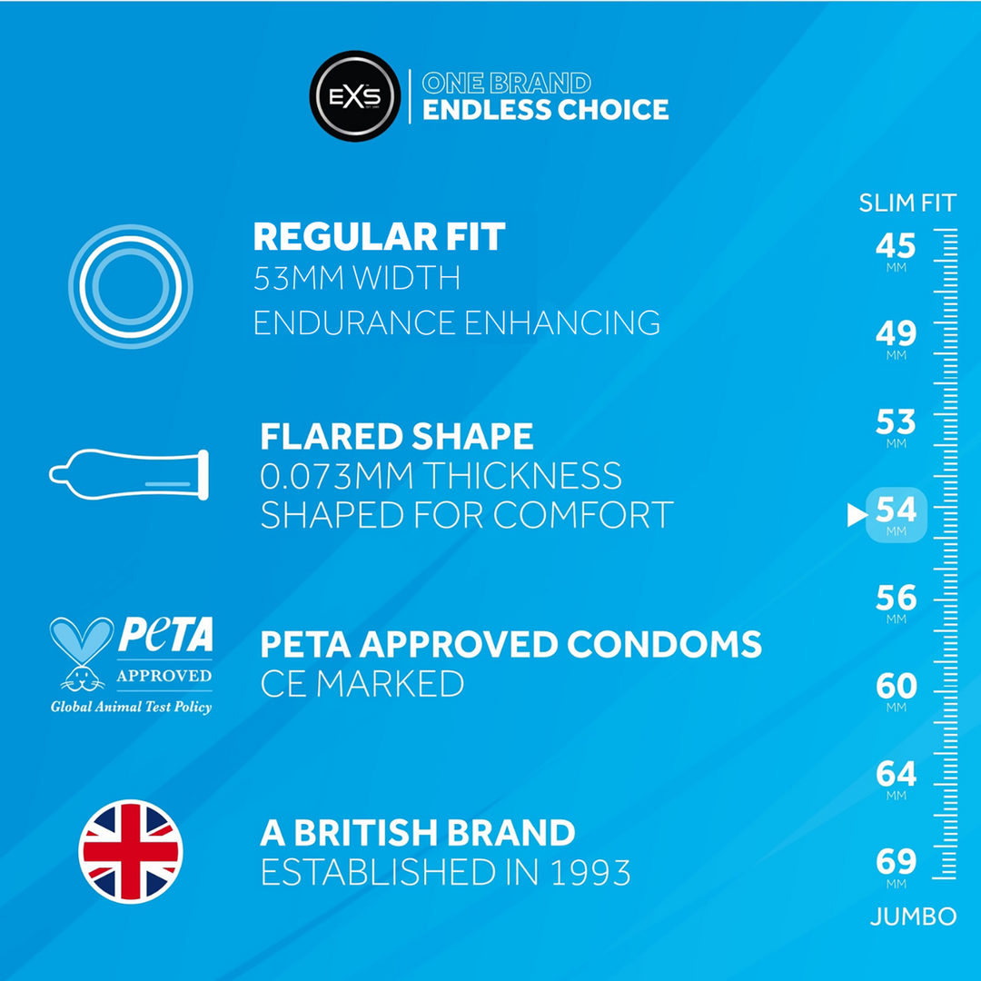 Delay-effect??? Helpt het moment te rekken Lidoca??ne binnenkant ??? Subtiel minder gevoelig Comfort fit 53 mm ??? Stabiel, prettig contact Siliconen glijmiddel ??? Soepel en comfortabel Praktische voorraad ??? 48 stuks voor vaak plezier Langer spelen zonder haast Soms wil je niet sneller, maarslimmer. De EXS Delay Endurance condooms 48 stuks zijn gemaakt voor wie graag wat extra tijd inbouwt: langer opbouwen, langer plagen, langer samen in die heerlijke spanning blijven. Perfect als je de controle wilt houden zonder dat het geforceerd voelt. Wat doen delay condooms precies? Aan debinnenzijde zit een lidoca??ne coating. Die helpt de gevoeligheid licht te verminderen, waardoor klaarkomen vaak later komt. Zo ontstaat er ruimte om te vari??ren met tempo, diepe ademhaling en aanrakingen, en om elkaar n??t wat langer te laten smelten. Comfortabel, stevig en soepel in gebruikHet straight walled ontwerp geeft een stabiele pasvorm, met een tepelvormige tip voor extra zekerheid. Met een dikte van 0,073 mm voelt het vertrouwd en betrouwbaar. Elk condoom is vooraf voorzien van siliconen glijmiddel en kan worden gecombineerd met waterbasis glijmiddel of siliconen glijmiddel.Geschikt voor vaginale, orale en anale seks. 48 stuks: ideaal om je ritme te vinden Met 48 stuks heb je genoeg om te ontdekken wat voor jullie werkt, zonder meteen een mega voorraad te nemen. EXS condooms worden streng getest volgens Europese normen en zijn CE-gecertificeerd. Ze zijn bovendien vegan, PETA approved en alcoholvrij. Houdbaarheid: minimaal 3 jaar vanaf aankoop. Specificaties&afmetingenAantal ??? 48 stuks Merk ??? EXS Condooms Type ??? Delay, glad Effect ??? Vertraagt ejaculatie Coating ??? Lidoca??ne binnenzijde Materiaal ??? Natuurlijk rubber latex Glijmiddel ??? Siliconen, niet zaaddodend Breedte ??? 53 mm Lengte ??? 190 mm Dikte ??? 0,073 mm Vorm ??? Straight walled Tip ??? Tepelvormig reservoir Alcoholvrij ??? Ja Certificering ??? CE, EU getest Vegan ??? Ja, PETA approved Houdbaarheid ??? Min. 3 jaar