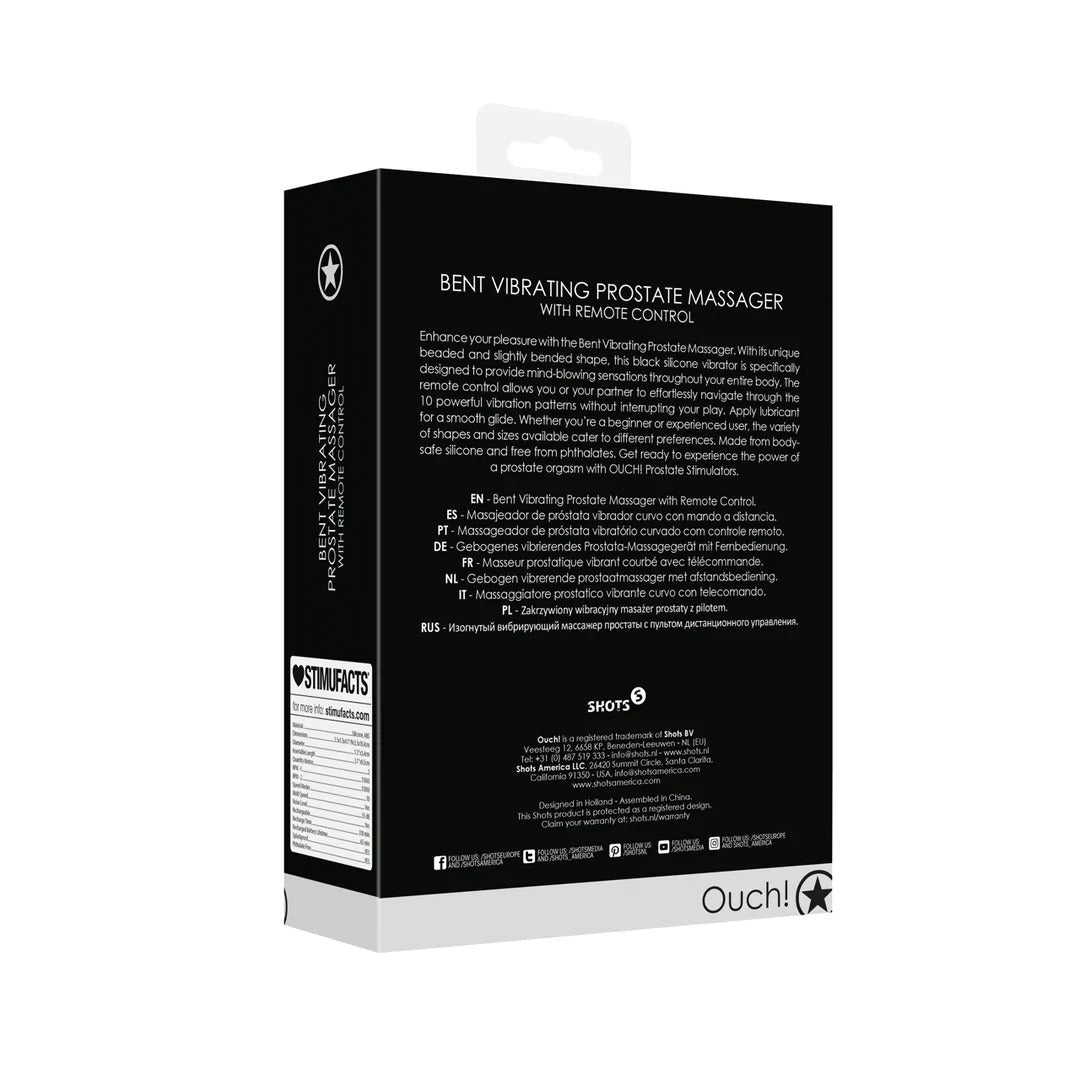 Perfecte kromming– Gericht op de P-spot 10 vibratiepatronen – Van tease tot tremor Dubbele motoren – Krachtige, diepe sensatie Afstandsbediening – Solo of partner control Zijdezacht silicone – Veilig&fluweelzachtOuch! Bent Prostaat Vibrator – Ontdek de kracht van de P-spot Til je genot naar een nieuw niveau met de Ouch! Bent Prostaat Vibrator – ontworpen om je prostaat nauwkeurig te raken met elke trilling. De lichte kromming volgt de natuurlijke lijnen van je lichaam en bereikt precies het gevoelige punt waar intensiteit en ontspanning elkaar ontmoeten. Met twee krachtige motoren en 10 standen van vibratie, pulsering en golvende ritmes, laat deze toy geen enkel zenuwuiteinde onberoerd. Solo of in good hands Gebruik de afstandbediening voor moeiteloze controle – of laat je partner hettempo bepalen. Dankzij het fluweelzachte body-safe siliconen voelt elke beweging soepel en luxueus aan. Perfect voor beginners én ervaren gebruikers die de diepere dimensie van prostaatstimulatie willen verkennen. Combineer met voldoende waterbasis glijmiddel en geef je over aan de intensiteit vaneen full-body orgasme. Specificaties&afmetingenTotale lengte: 10,4 cm Inbrengbare lengte: 9,5 cm Diameter: 3,4 cm Gewicht: 110 g Materiaal: siliconen, ABS (ftalaatvrij) Vibratiemodi: 10 standen Motoren: 2 RPM: 11.000 Geluidsniveau: 55 dB Oplaadbaar: ja | Laadtijd: 110 min Gebruiksduur: tot 65 min Waterbestendig: nee Bediening: afstandbediening inbegrepen Reiniging: lauw water&toycleaner, droog bewaren