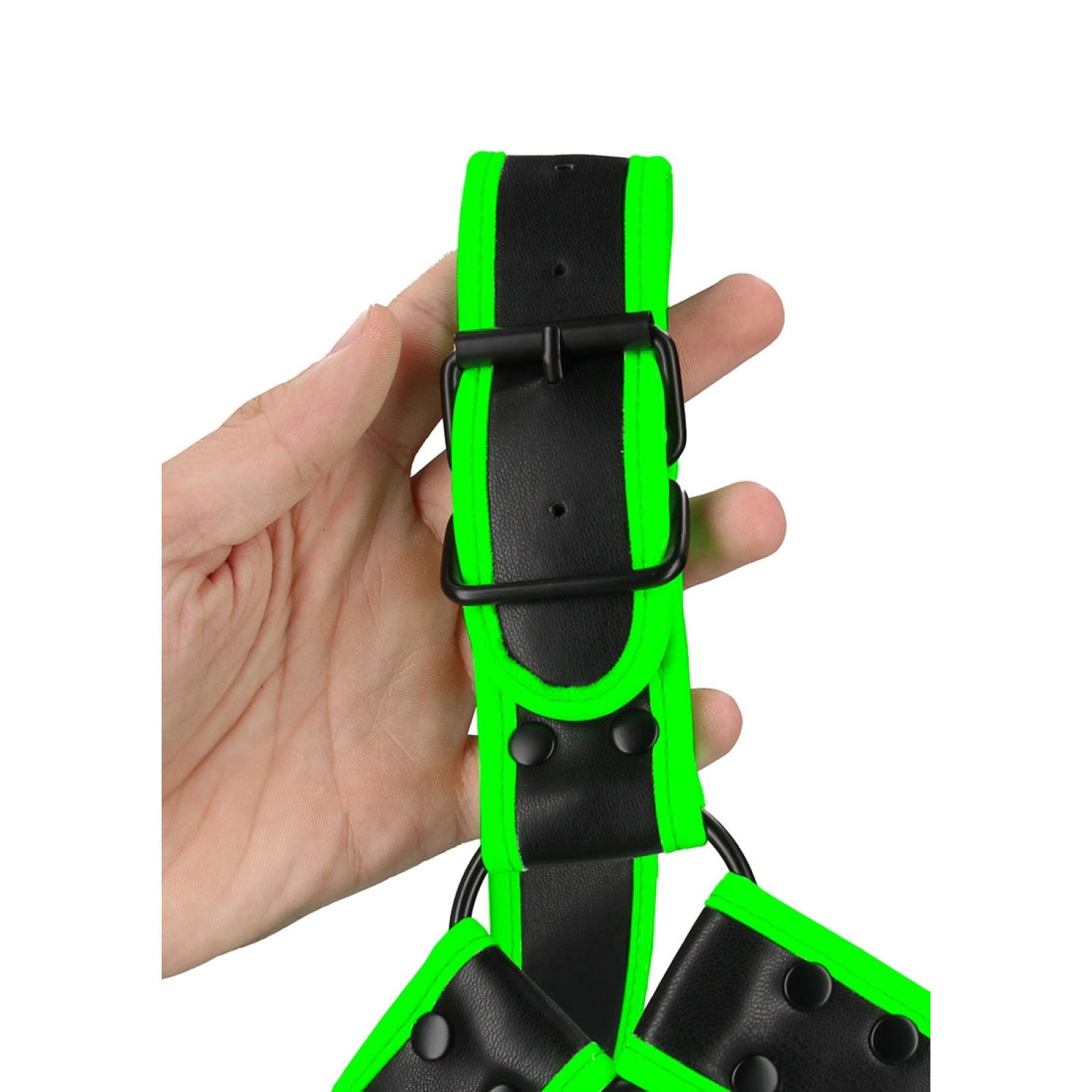 Lichtgevend bulldog harnas voor mannenRobuuste gesp voor extra stoere uitstralingGlow-in-the-dark details voor spannende nachtenVerstelbaar voor een comfortabele pasvormPerfect voor feestjes en rollenspelVerlicht je fantasie met het Bulldog Harnas Zet jezelf in het middelpunt van de aandacht met het Ouch! Glow in the Dark Bulldog Harnas met Gesp. Stoer, sexy en onmiskenbaar mannelijk â dit harnas accentueert je bovenlichaam op precies de juiste plekken. Dankzij de brede banden en opvallendegesp straal je kracht uit, terwijl de glow-in-the-dark accenten voor een speels, futuristisch randje zorgen. Het harnas is volledig verstelbaar en ontworpen om jouw lichaamsvorm perfect te laten uitkomen. Of je nu solo shinet in de spiegel of indruk wilt maken tijdens een kinky avondje, dit harnasis jouw geheime wapen. Zodra het licht uitgaat, komt de magie tot leven: de fluorescerende groene lijnen beginnen te gloeien en maken van elke beweging een spannend schouwspel. Stoer design met een lichtgevend randje Dit is bondage in een modern jasje. Het harnas heeft die rauwe, authentiekelook waar Ouch! bekend om staat, maar dan met een glow-in-the-dark twist die je niet snel vergeet. Laad het op onder (zon)licht en geniet in het donker van een unieke visuele ervaring. De stevige gesp aan de voorkant geeft het geheel een extra stoere uitstraling, terwijl het zachte maar robuuste materiaal zorgt voor comfort én stevigheid. Ideaal voor avontuurlijke stellen, kinky feestjes of gewoon… omdat het kan. Specificaties Materiaal: Kunstleer (PU) en metaal Kleur: Zwart met groene glow accenten Verstelbaar: Ja, geschikt voor meerdere maten Type sluiting: Stevige gesp aande voorzijde Glow-effect: Activeren met (zon)licht Afmetingen Borstomvang: Verstelbaar van ca. 90 tot 120 cm Bandbreedte: Ongeveer 3 cm Lengte schouderband: Ca. 35 â 50 cm