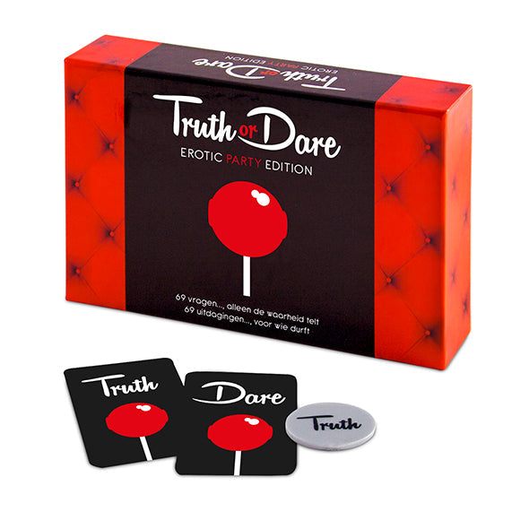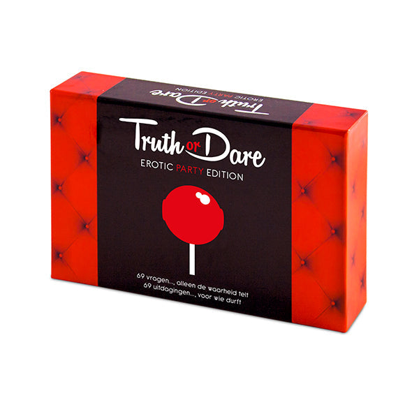 69 ondeugende vragen&69 uitdagingenSpeels partyspel voor 3+ vriendenKies: waarheid of durf!Vol humor, spanning en verleidingExclusief NederlandstaligTease&Please– Truth or Dare Vragen Erotic Party Edition (NL) Ben jij het type dat altijd eerlijk is… of liever stout?Met de Truth or Dare Vragen – Erotic Party Edition van Tease&Please gooi je elk feestje over een compleet andere (en sexy) boeg. Dit ondeugende spel bevat 69 pittige vragen en 69 brutale opdrachten die zorgen voor schaamrood, slappe lachén een heleboel spanning. Perfect voor 3 of meer vrienden (18+ only!) die klaar zijn om zich van hun meest openhartige of gedurfde kant te laten zien. Laat het lot beslissen: Truth of Dare? Je gooit de Truth or Dare-munt en ontdekt je lot: Truth? Dan moet je met de billen bloot. Hoe eerlijker (en gedetailleerder), hoe meer punten. Dare? Dan is het showtime! Durf jij het aan om de uitdaging te volbrengen? Geen zin? Geen probleem. Maar let op: je verliest wél punten. Alles mag, niets moet — behalve lachen en blozen! Wat kun je verwachten? “Wat is jouw stoutste fantasie?” “Vraag om spanking van de speler links van je. Drie tikken, niet meer – of wel?” “Lig geblinddoekt, armen langs je lichaam. Raad van wie die hand op je buik is…” “Zoek geblinddoekt een muntje onder iemands kleding. Tijd om je zintuigen te gebruiken.”Dit spel zorgt voor hilarische ontboezemingen, speelse spanning en misschien zelfs verrassende ontdekkingen over je vrienden(groep) 😉 De ideale partystarter Of je nu een huisfeestje hebt, een vrijgezellenavond organiseert of gewoon zin hebt in iets pittigs vóór het stappen: Truth or Dare Vragen – Erotic Party Edition zorgt voor vuurwerk. Speel met punten? Bepaal dan vooraf wat de winnaar mag eisen van de verliezer. En als jullie het niet kunnen verzinnen… dan helpt het spel jullie wel op weg 😏 Productspecificaties Taal: Nederlands Aantal spelers: 3 of meer (18+)Aantal kaarten: 138 (69 vragen, 69 opdrachten) Inhoud: Kaarten, Truth or Dare-munt, spelregels Type spel: Erotisch partyspel met lef en humor Afmetingen verpakking Lengte: ca. 17 cm Breedte: ca. 12 cm Hoogte: ca. 4 cm Zin in een avond vol verleiding, fun en brutale opdrachten?Truth or Dare Vragen – Erotic Party Edition is dé must-have partygame — exclusief verkrijgbaar bij Erovibes. Wie durft? 😈